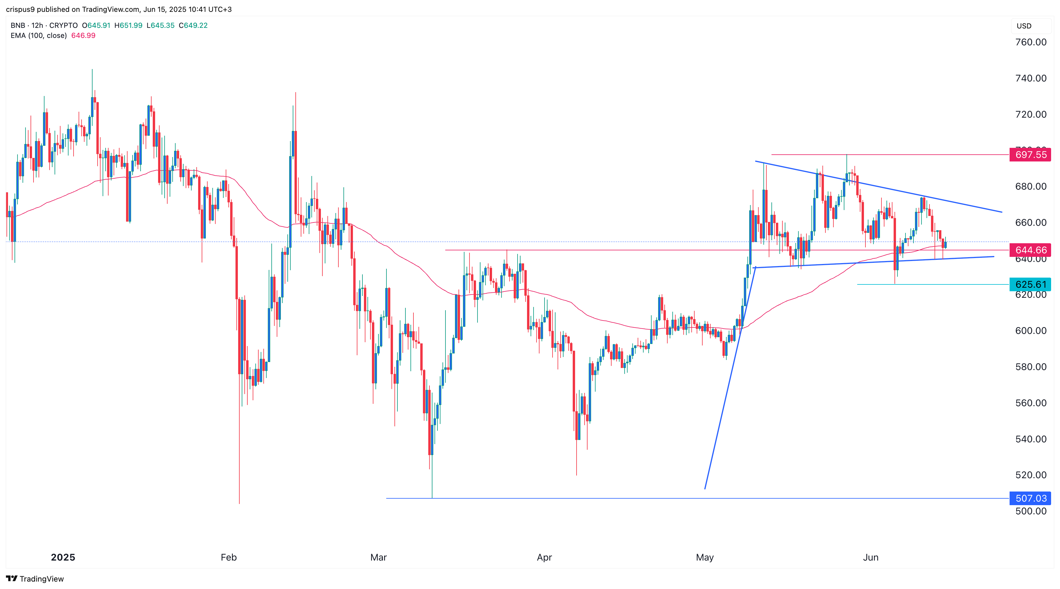 Binance Coin (BNB) token dropped to $650 today, June 15, down by 6.70% from its highest point this year and 18% from the year-to-date high.