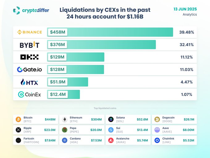 Analytical platform CryptoDiffer reported that $1.16 billion worth of liquidations occurred on centralized exchanges (CEXs) over the past 24 hours. Geopolitical tensions, particularly Israel’s military strike on Iran, are widely seen as the main driver behind this sharp surge. The attack caused a stir in the world markets, leading to a sharp drop in Bitcoin’s value and widespread liquidations across major cryptocurrency exchanges.